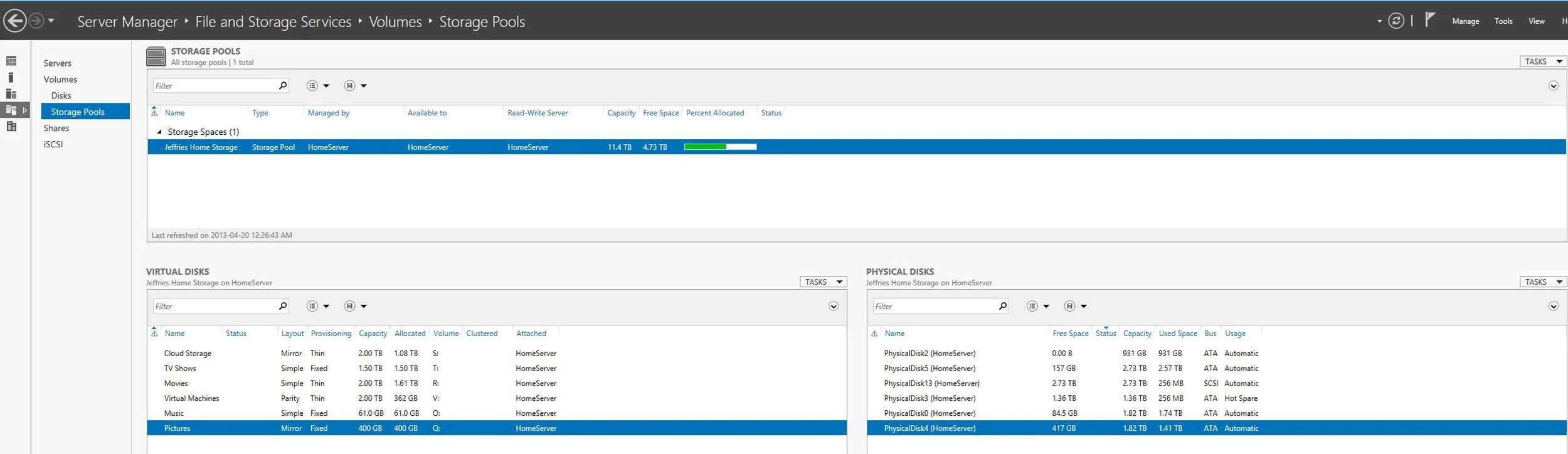 Finally, the Windows Server acts as a file server for all my needs. All my archived media, data, pictures and backups are on here. I'm using Storage Pools to make it all happen and, as you can see below, I'm running at about 6TB in use, although that's somewhat misleading.